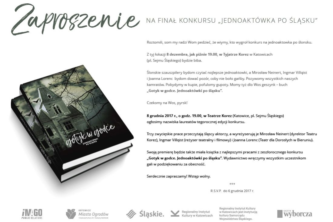 Oto mamy piękną rocznicę konkursu na jednoaktówki po śląsku! Z tej okazji postanowiliśmy trochę inaczej niż dotąd celebrować to wydarzenie. Uważni sympatycy zapewne zauważyli, że w tym roku nie ogłosiliśmy konkursu. Przygotowaliśmy za to niespodziankę – przypomnimy trzy jednoaktówki, które naszym zdaniem były „kamieniami milowymi” projektu. To już 10 grudnia w Teatrze Korez o godz.…